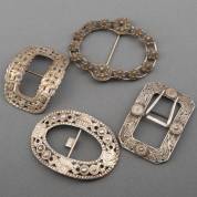 Vier zilveren gespen, diverse gehaltes en stijlen, waaronder één met filigrain en één gedecoreerd met Zeeuwse knopen, gewicht 144 gram, grootste circa 10 × 8 cm