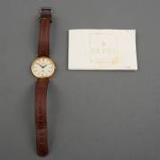 Goudkleurig stalen damespolshorloge, Gucci, quartz uurwerk, aan bruin lederen band, met originele papieren -email sleets-