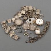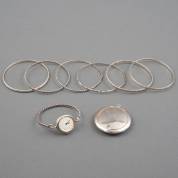 Zes 2e gehalte zilveren rinkelbanden met motief, daarbij: 2e gehalte zilveren horloge, en 1e gehalte zilveren hanger met spiegeltje, brutogewicht 92,4 gram,