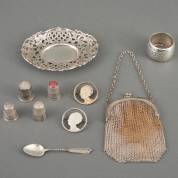 Divers klein zilver, diverse gehaltes, waaronder: vier vingerhoedjes en een maliënbeursje, gewicht 110 gram, schaaltje 10 × 7,3 cm