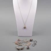Divers klein zilverwerk, diverse gehaltes, waaronder 2e gehalte zilveren glashouder, 1e gehalte zilveren open hanger om verschillende stenen bollen in te dragen, en ring met kleurstenen, mt. 16,75, en faux parelcollier, brutogewicht 66,7 gram