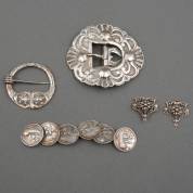 Drie zilveren gespen en zes 2e gehalte zilveren knopen met gedreven decor van een driemaster, Ø 2,2 cm, gewicht totaal 83 gram, grootste gesp 8 × 7 cm