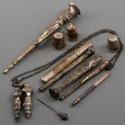 Divers zilveren naaigerei, veelal 2e gehalte, waaronder drie vingerhoedjes, naaldenkoker en breischede, gewicht 106 gram, breischede 14,5 cm