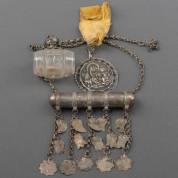 Etnisch zilveren collier met stam met bedels, zilveren hanger van Maria met Jezus en kristallen tonvormig parfumflesje met zilveren montuur en dop, gewicht zilver 60 gram, lengte collier 48 cm
