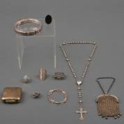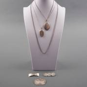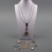 Diverse zilveren sieraden, diverse gehaltes, twee portretmedaillons, drie colliers en drie broches, brutogewicht 61,8 gram, grootste broche 6 × 4 cm