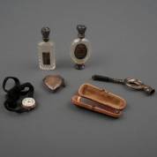 Divers klein zilverwerk, diverse gehaltes, waaronder twee kristallen parfumflacons en een sigarettenpijpje, daarbij: sigarettenpijpje met 14kt gouden montuur, in doosje