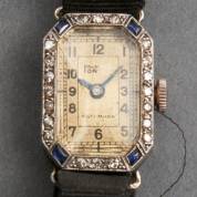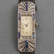 Platina damespolshorloge, art deco, mechanisch uurwerk, volledig gezet met saffier en diamant, aan zwart stoffen band, brutogewicht 12,1 gram, kast circa 4 × 1,5 cm