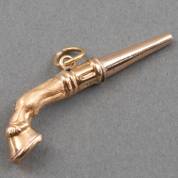 14kt gouden horlogesleutel in de vorm van een paardenvoet, aan hangoog, brutogewicht 3,2 gram, lengte circa 4,5 cm