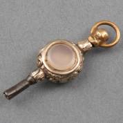 BWGG horlogesleutel gezet met carneool aan hangoog, brutogewicht 4,2 gram, lengte circa 3,5 cm