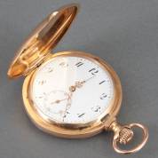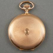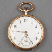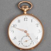 14kt gouden herenvestzakhorloge, mechanisch uurwerk, wit geëmailleerde wijzerplaat met chrono seconde-aanduiding, achterzijde met gegraveerd dorpsgezicht, brutogewicht 55,8 gram, circa Ø 4 cm, in houten cassette