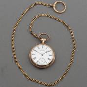 14kt gouden herenvestzakhorloge, American Witham Watch Company, mechanisch uurwerk, witgeëmailleerde wijzerplaat met chronografische secondeaanduiding, aan BWGG horlogeketting met onedele sluitingen, brutogewicht 86 gram, lengte circa 52 cm, Ø 4,5 cm