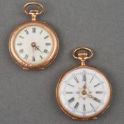 Twee 14kt gouden damesremontoirs, mechanisch uurwerk en wit email wijzerplaat, brutogewicht 34,0 gram, grootste Ø 2,5 cm -defecten-