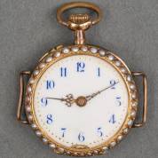 14kt gouden damesremontoir, wit geëmailleerde wijzerplaat omlijst door zaadpareltjes, de achterzijde met blauw email en fleur-de-lis gedecoreerd en eveneens omlijst met zaadpareltjes, twee bandaanzetten van later datum, brutogewicht 15,0 gram, circa Ø 2,5 cm -glas ontbreekt-