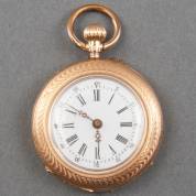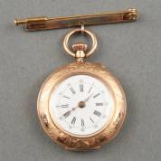 Damesremontoir met witgeëmailleerde wijzerplaat, in 14kt gouden kast met gegraveerd decor van linten, aan speld, brutogewicht 23,4 gram, Ø 3 cm, in houten doosje
