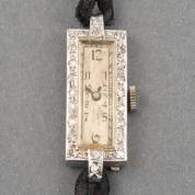 Platina damespolshorloge, art deco, mechanisch uurwerk, de bezel pavégezet met achtkantgeslepen diamantjes, aan zwarte koordband met onedele sluiting, brutogewicht 10,6 gram, kast circa 2 × 1 cm