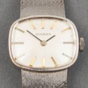 14kt witgouden damespolshorloge, Dugena, mechanisch uurwerk, zilverkleurige wijzerplaat met goudkleurige becijfering, aan 14kt witgouden Milanese band, brutogewicht 33,4 gram, draaglengte 17 tot 19 cm