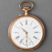 14kt gouden herenvestzakhorloge, mechanisch uurwerk, met wit geëmailleerde wijzerplaat met chronografische seconde-aanduiding, brutogewicht 67,4 gram Ø circa 4,5 cm, in defecte cassette