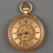 18kt gouden damesremontoir, mechanisch uurwerk, gouden wijzerplaat met bloemdecor, ook de kast met rijk gegraveerd decor, brutogewicht 28,4 gram, Ø 3,2 cm -gebruikssporen-