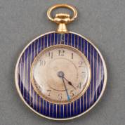 18kt gouden damesremontoir met blauw geëmailleerd strependecor, de achterzijde centraal gezet met roosdiamant, brutogewicht 30,2 gram, circa Ø 3 cm