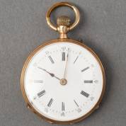 14kt gouden damesremontoir, Condor, mechanisch uurwerk, witgeëmailleerde wijzerplaat met chronoseconde-aanduiding, achterdeksel met geguillocheerd decor, brutogewicht 25,2 gram , Ø circa 3 cm