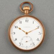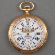 14kt gouden herenvestzakhorloge, La Couronne, witgeëmailleerde wijzerplaat met chronograaf, achterdeksel met geguillocheerd decor, Ø 4,8 cm, in doosje