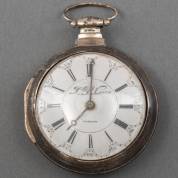 Herenvestzakhorloge D.D. Neveren, Londen, met witgeëmailleerde wijzerplaat met Romeinse uuraanduiding in gladde zilveren kast en extra beschermkast met papieren label van H. Middendorp, Groningen, eind 19e eeuw, brutogewicht 126,0 gram, Ø 6 cm