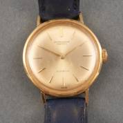 14kt gouden damespolshorloge, IWC, automaat, ronde kast, goudkleurige wijzerplaat, aan blauw lederen band, brutogewicht 23,2 gram, Ø 2,3 cm