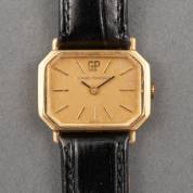 18kt gouden damespolshorloge, Gerard Perregaux, octagonaal gevormde kast met gouden wijzerplaat, mechanisch uurwerk, aan zwart lederen band, brutogewicht 18,8 gram, kast 2,5 × 1,5 cm