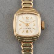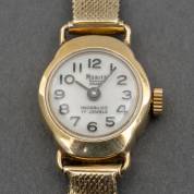 14kt gouden damespolshorloge, Ancre, model Incabloc, aan 14kt gouden band, lengte circa 17,5 cm, brutogewicht 17,2 gram