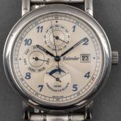 Stalen herenpolshorloge, Christiaan van der Klaauw, model Pallas, automaat, drie chronometers en datumaanduiding, aan stalen schakelband, inclusief doos en origineel blauw lederen bandje met klipsluiting, kast Ø 38 mm