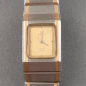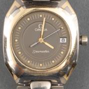 Stalen damespolshorloge, Omega, De Ville, quartz uurwerk, rechthoekige kast met goudkleurige wijzerplaat, aan stalen schakelband met gouden streepmotieven
