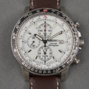 Stalen herenpolshorloge Seiko, Solar Chronograph, aan bruin lederen band, garantiebewijs bijgevoegd -niet getest-