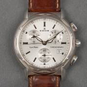 Stalen herenpolshorloge Edox Les Pres Chronograph, aan bruin lederen band, inclusief garantieboekje zonder kaart -niet getest, bandje aan één zijde afgebroken-