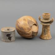 Hans de Jong (1932-2011), keramische kandelaar in de vorm van een figuur -schilfertje-, daarbij: dekseldoosje, gemerkt 'Z' -chipje van deksel-, en organische sculptuur, gemerkt 'MH', formaat kandelaar 14 × 9 × 7 cm