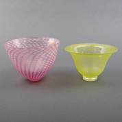 Twee glazen vazen op smalle voet: één iriserend roze, ontwerp Bertil Vallien, uitvoering Kosta Boda, Zweden, genummerd 58436, de ander lichtgroen met decor van kleine spiralen, eind 20e eeuw