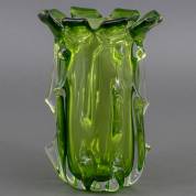 Groen glazen vaas met vrij gevormde ribben, vermoedelijk uitvoering Fratelli Toso, Murano, midden 20e eeuw, 20 × Ø 14,3 cm