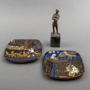 Bronzen beeldje: harlekijn, niet gesigneerd, op zwart granieten sokkel, totale hoogte 33 cm, daarbij: twee aardewerk jaarbordjes met sprookjesdecor, uitvoering Arabia, 1979 en 1980