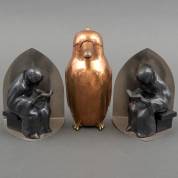 Paar boekensteunen met monniken, Metawa, Tiel, circa 1930, hoogte 14,7 cm, daarbij: koperen kannetje in de vorm van een vogel, hoogte circa 18 cm