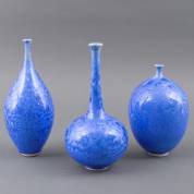 Willy van Bussel (1951), drie keramiek vaasjes met smalle hals en blauw kristalglazuur -één met gelijmde hals-, 26,5 cm × Ø 13 cm
