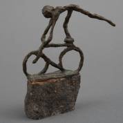 Jits Bakker (1937-2014), fietser staat op zijn zadel, brons, gesigneerd, op natuurstenen basement, afmetingen inclusief basement 10,5 × 9 × 4 cm