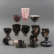 Kathy Erteman (1952), zes zwartgeglazuurde aardewerk kommen op voet, gemonogrammeerd en gedateerd '84, en divers keramiek, waaronder drie asymmetrische vaasjes, roze lusterglazuur vaas, etc., hoogte kommen 9 cm
