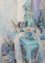 Chrit Rousseau (1941), stilleven met vaatwerk op een tafel, pastelkrijt op papier, r.o. gesigneerd en gedateerd '91 -barst in rand van glas-, 70 × 50 cm