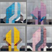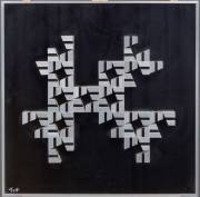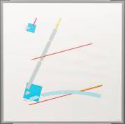Minimalistisch vierluik: vierkante abstracte voorstellingen van aluminium en geëmailleerde plaatjes op karton, r.o. onduidelijk gesigneerd: Gunther Koch?, 45 × 45 cm
