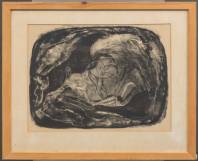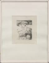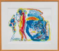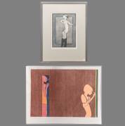 Werner Moonen (1940-2011), twee werken op papier: gluren, houtsnede op vloeipapier 36/100, r.o. gesigneerd en gedateerd 1976, 40 × 57 cm, en staand vrouwelijk naakt, kleurenets 16/37, r.o. gesigneerd, 29 × 20 cm, herkomst: Collectie Galerie Jas, Utrecht