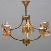 Drielichts messing kroonluchter met bloemvormige glazen iriserende kappen, vermoedelijk uitvoering Sische leuchten, jaren '60/'70 -messing geoxideerd-, 43 × Ø 40 cm