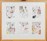 Guusje Kaayk (1950), 'De Oecumenische vesper in de Goede Week in de Ceciliakapel', zes tekeningen in lijst, gemengde techniek op papier, alle getiteld, r.o. gesigneerd en gedateerd '05, circa 20 × 27 cm per tekening