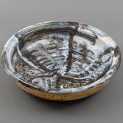 Grote keramische schaal met blauw- en zwartgeglazuurde binnenzijde, op onderzijde gesigneerd 'Henk' en gedateerd 1987, 11 × Ø 43 cm