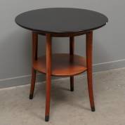 Rond salontafeltje met zwartgelakt blad en beukenhouten onderstel, uitvoering Giorgetti -één van de vier schroeven onder het tafelblad ontbreekt-, 63 × Ø 60 cm