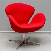 Draaistoel met rode, stoffen bekleding op chromen draaipoot, reproductie naar ontwerp van Arne Jacobsen, uitvoering onbekend, modern, 82 × 73 × 73 cm