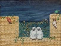 Schilderij: twee jonge uilen en slakken op een muurtje, olieverf op doek, gemonogrammeerd DG en gedateerd '74, 35 × 45 cm